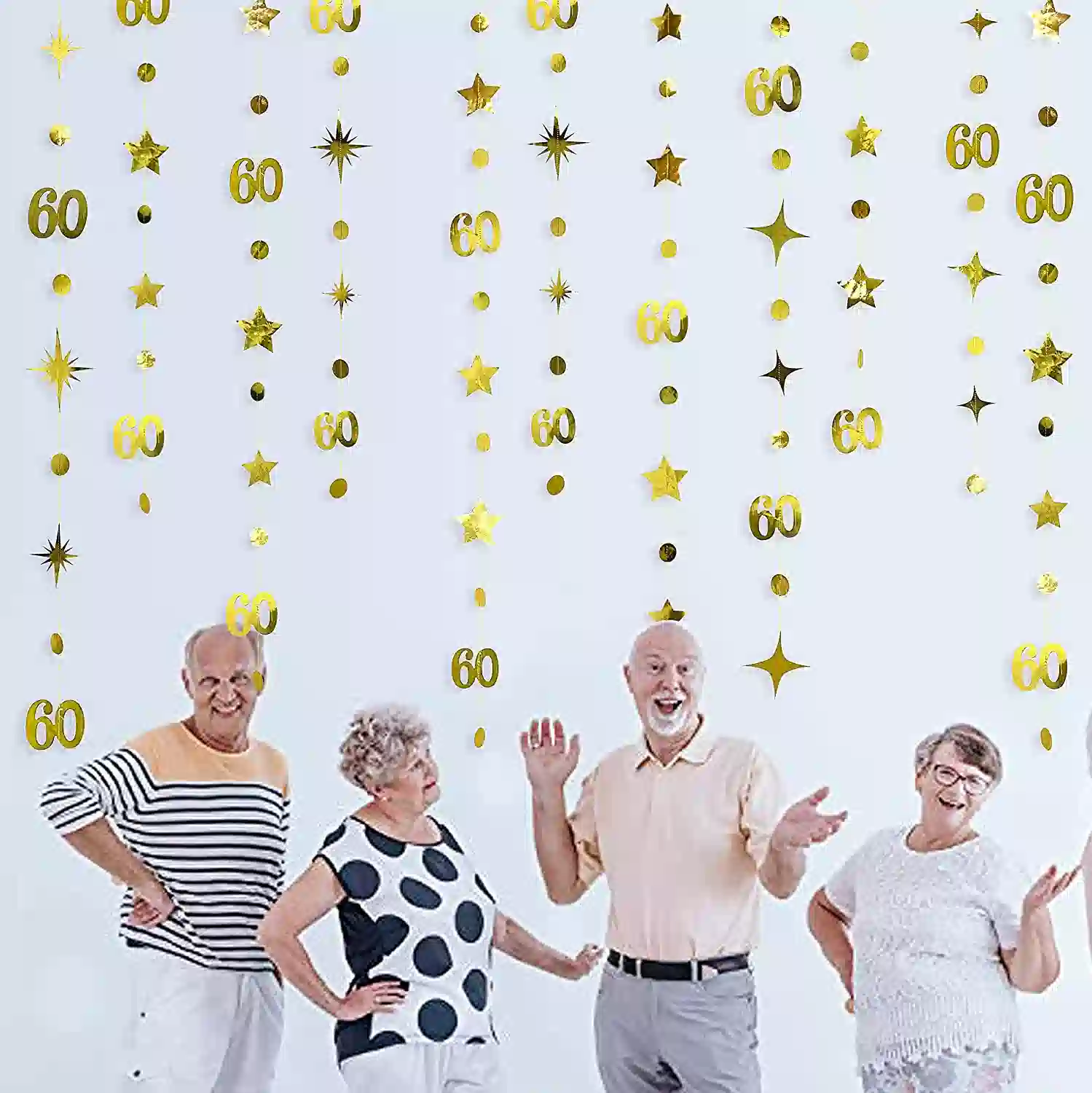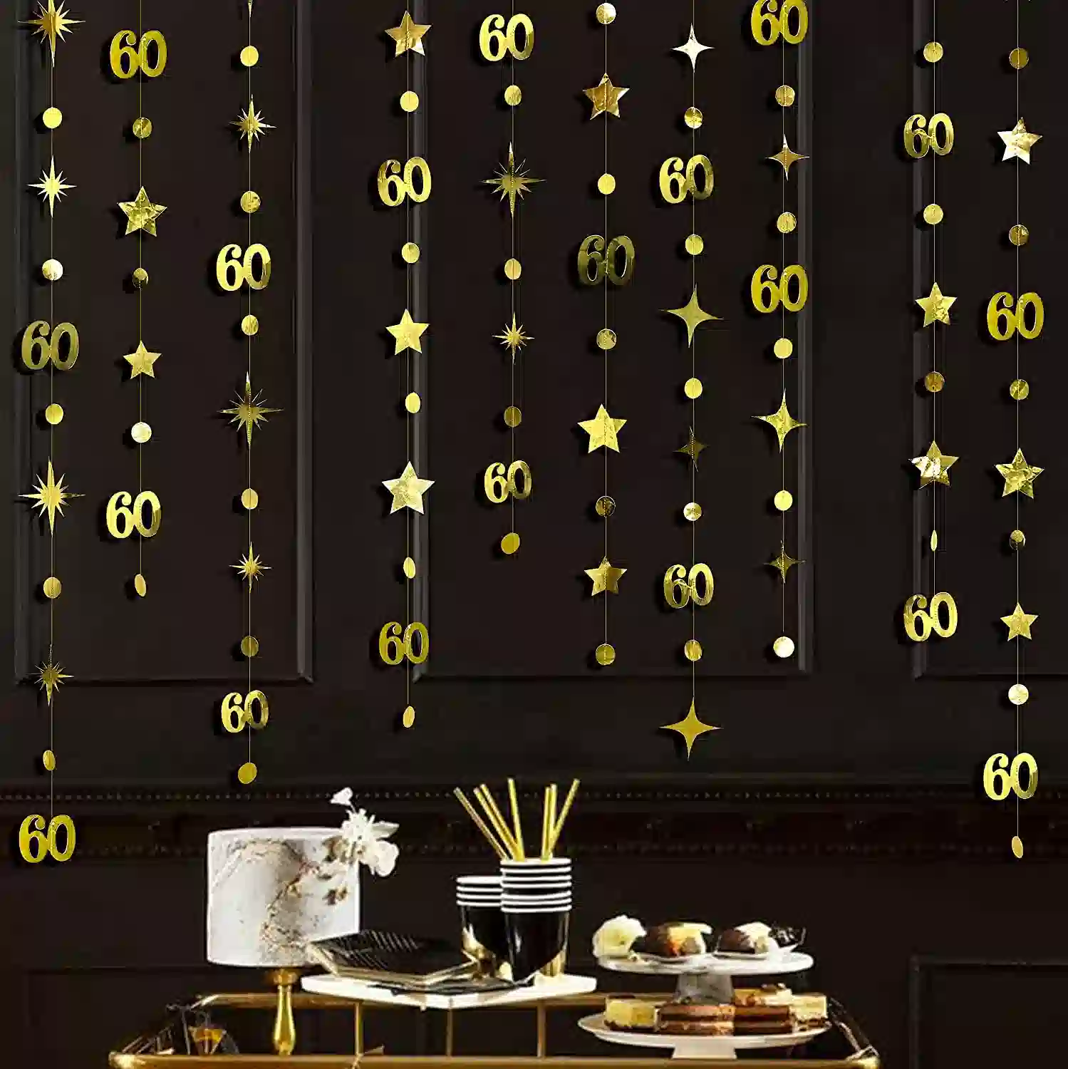 Celebrate six decades of memories with our Gold 60th Birthday Garland Banner. Designed with bold metallic “60” numbers, shimmering circle dots, and twinkle star accents, this elegant hanging streamer backdrop adds sparkle and sophistication to any 60th birthday or 60th anniversary celebration.