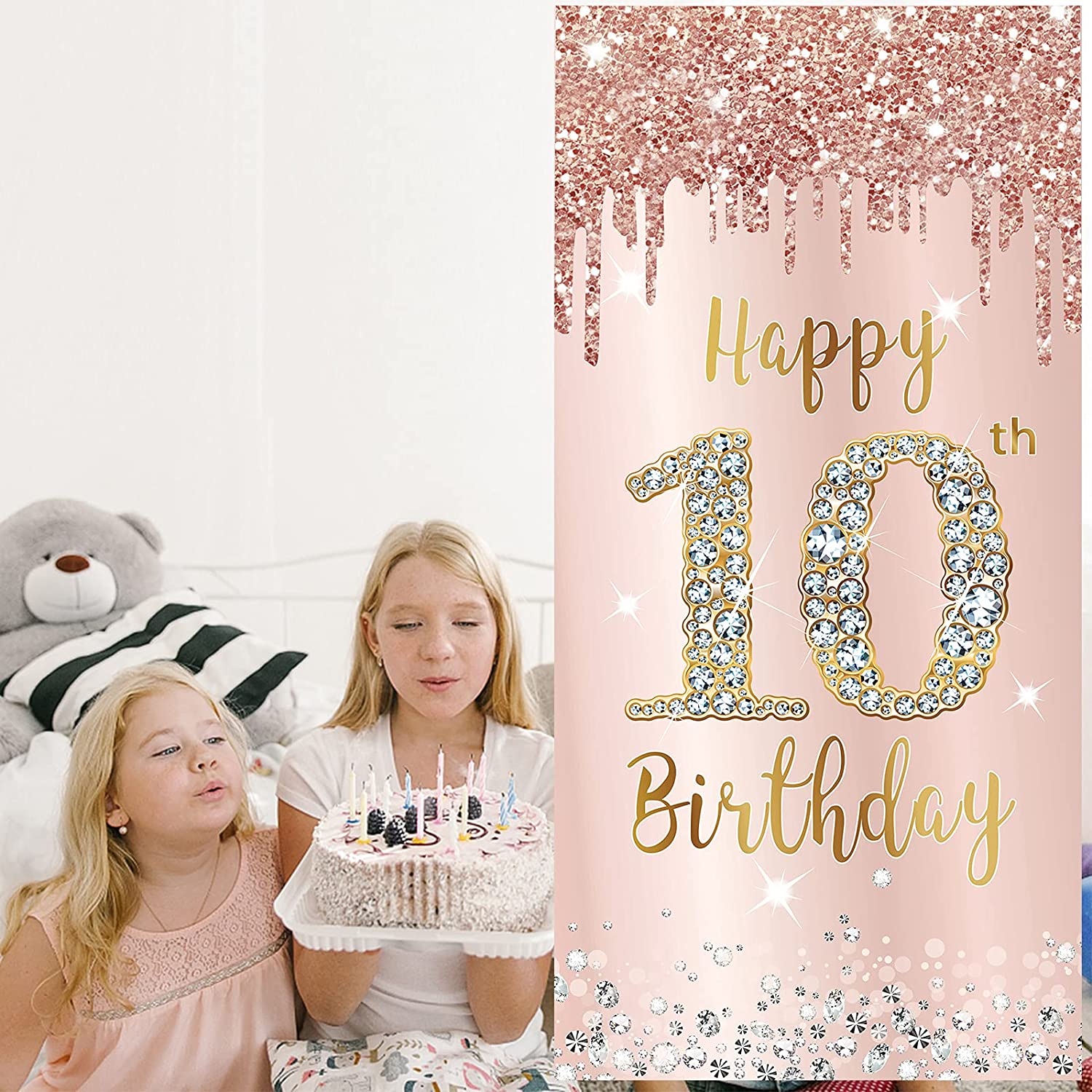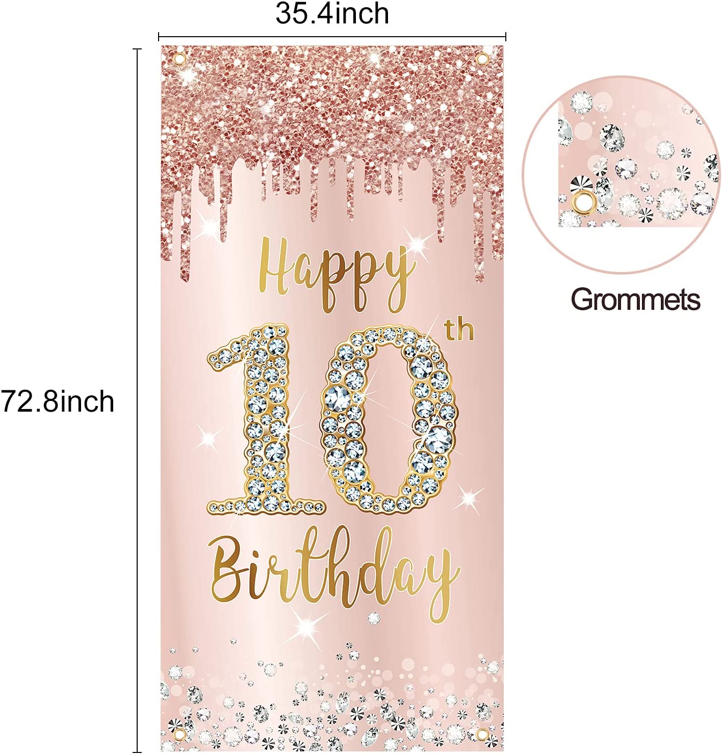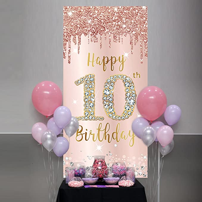 Item- Pink rose gold 10th birthday party door banner decoration, 72.8 X 35.4 inches, enough to decorate the 10th birthday party, making your birthday party full of vitality and fun.