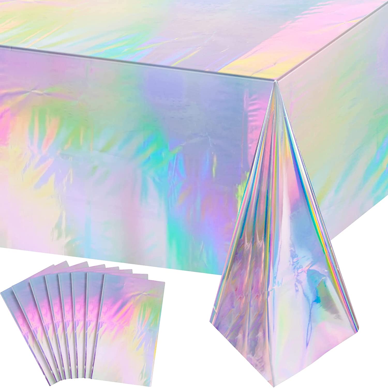 Package Includes: You will receive 8 pieces shiny iridescence plastic tablecloth. Each holographic tablecloth measures approx 54 x 108 inches/ 137 x 274 cm, fits any rectangular table up to 8 feet in length, suitable for party decoration.