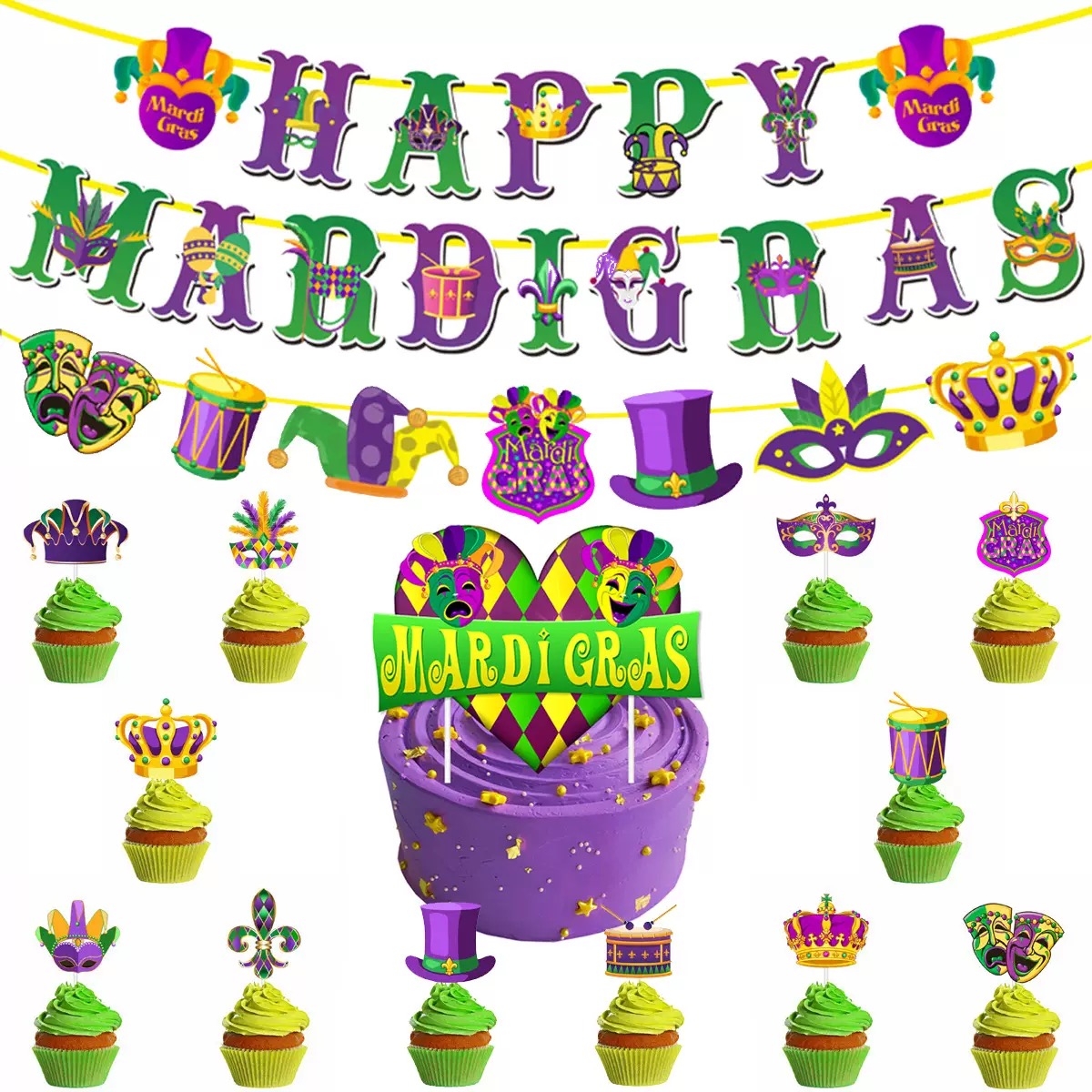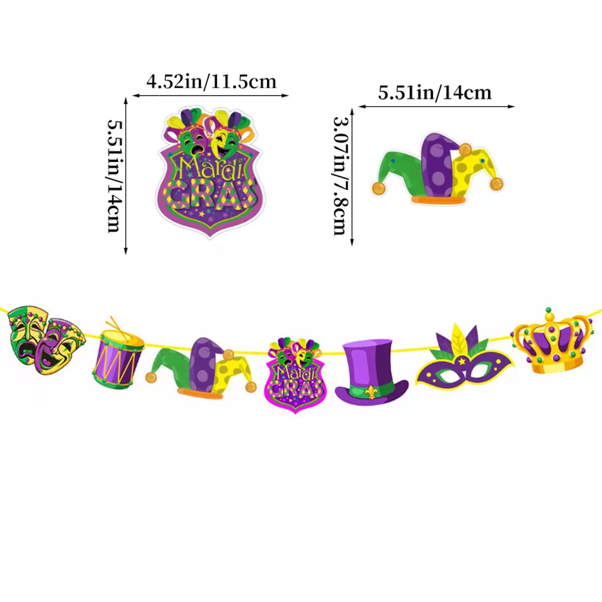 The set features a bold “HAPPY MARDI GRAS” letter banner, along with decorative garlands showcasing classic carnival elements such as clown hats, masks, drums, and feathers. Perfect for Mardi Gras parties, carnival events, themed celebrations, and event planners, this all-in-one kit makes decorating easy and eye-catching.