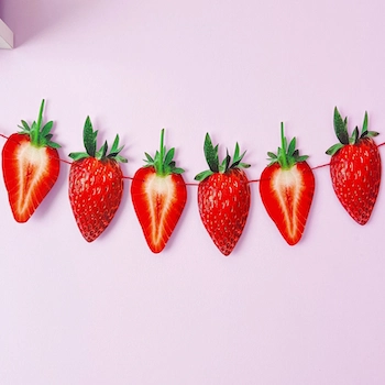Each garland measures 2 meters in length (custom lengths available upon request). Individual strawberry cards measure approximately 16–20 cm in height, and we can fully customize the size, color, and design to match your event theme.